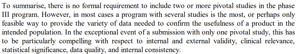 - [A review paper on use of single pivotal trials] Morant, A.V. and Vestergaard, H.T. European Marketing Authorizations Granted Based on a Single Pivotal Clinical Trial: The Rule or the Exception?. Clin Pharm Ther 104:169-177, 2018, doi: 10.1002/cpt.900.
