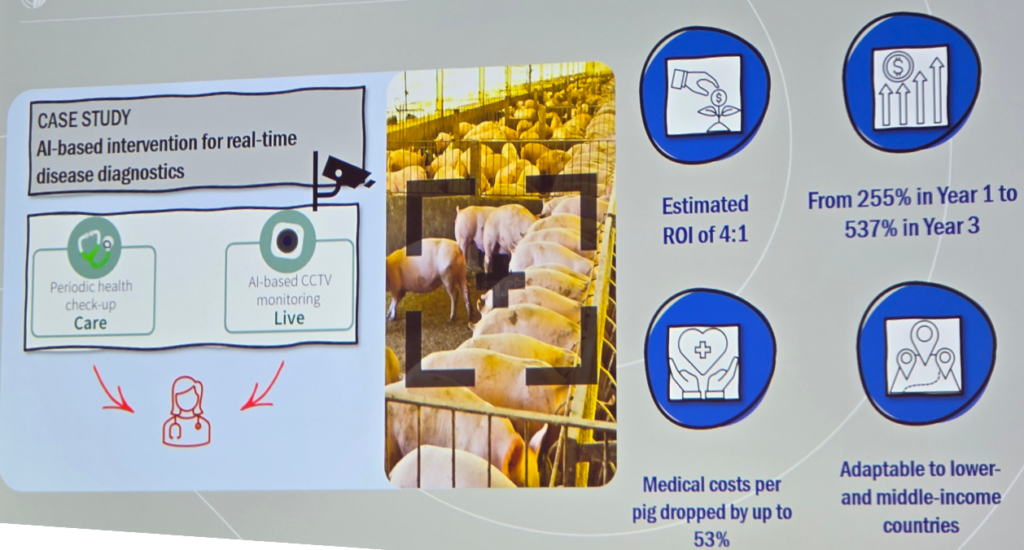 Fifth, Javier Yugueros-Marcos (World Organisation for Animal Health) reminded us that AMR is already causing $17b in annual GDP losses in livestock production with the potential for the cost to rise to $159b annually by 2050 if we don’t act (26 Sep 2024 report from WOAH). Building on a classic concept with his title “A gram of prevention or a kilo of cure,” he showed the potential for modern interventions to have a huge impact (in this example using AI-enabled CCTV monitoring):